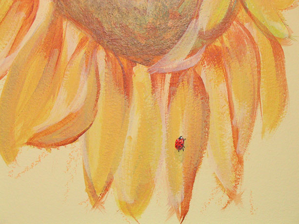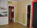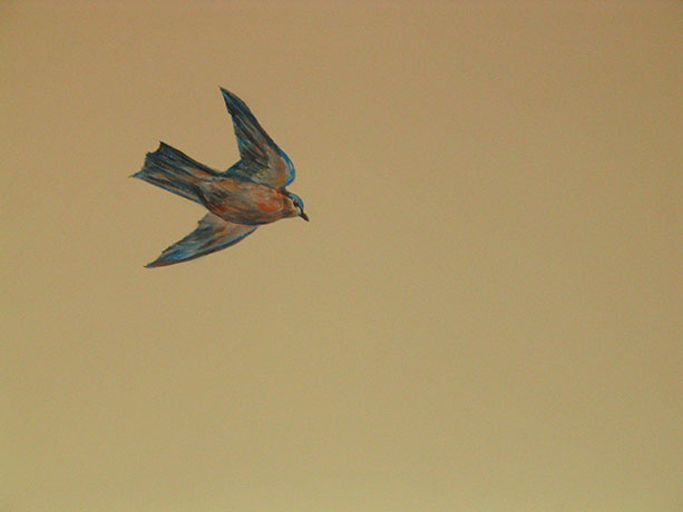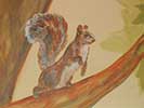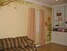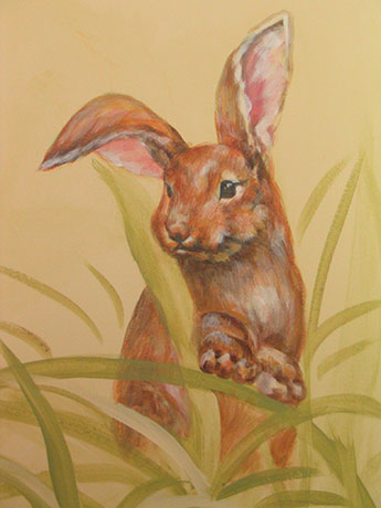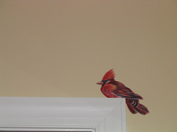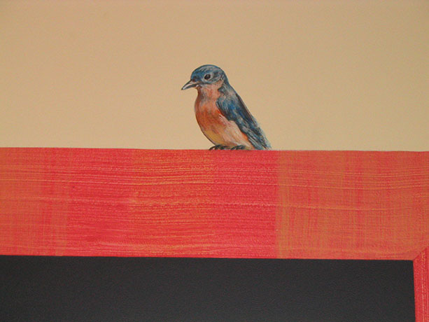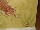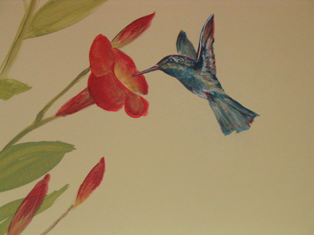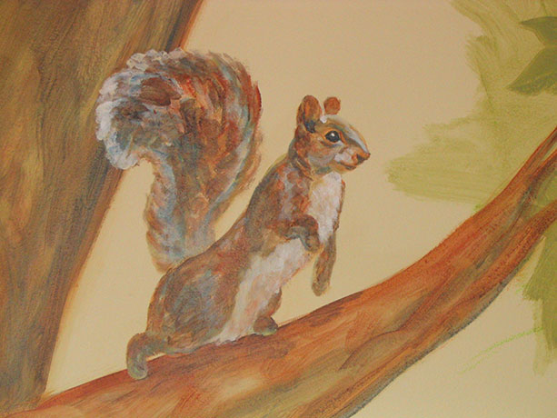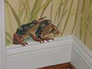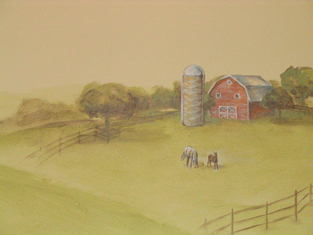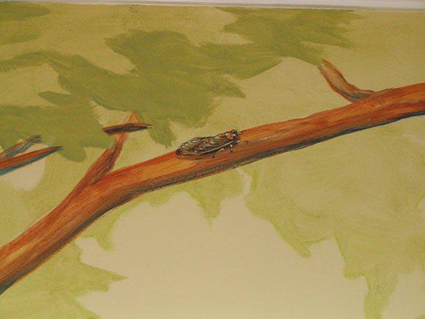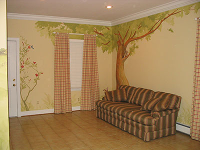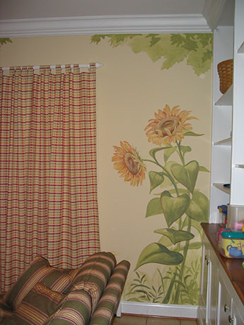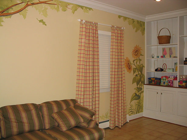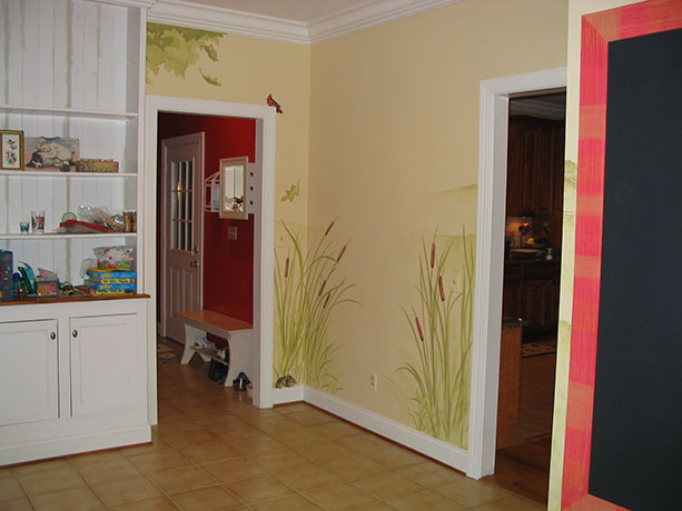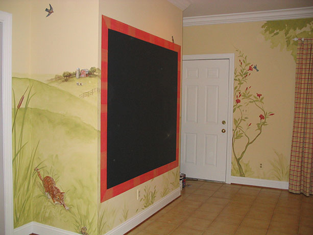 This room connects to a mud room which connects to the driveway, garage, and a backyard pool. As such, it is the first real room seen in the client's home. She wanted to create an environment, for her twins, that would ease the family from the garden and views outdoors to this playful intermediary room indoors. She and her family spend a great deal of time enjoying the countryside of Jarretsville, Maryland. Also, she had begun a taped-up gallery of her twins' artwork over many of the walls. The cherished various arworks collectively creating a visual paper avalanche as soon as one entered the house. She wanted a more contained orderly way to display their work and an environment that would inspire their creativity. With this in mind we planned a huge magnetic blackboard to be painted on the one wall not visible from the entrance ways. It is tall enough to offer plentiful gallery space at the top for papers and ample space below for the twins' self-prescribed "his" and "her" sides for chalk drawings. The blackboard is framed by a plaid strip to match the cheery plaid drapery. The drapery set the color themes: the walls were already a pale yellow to match, and the cherry-coral red and spring green also featured prominently in the mural. The client and I planned color washy green foliage: tree leaves, grasses, and vines to act as borders and a unifying color theme in the room. The red was used as points of punctuation around the room. The twins love animals and bugs so their mom requested bluebirds, a cicada to subtely note the year (2004), their cat and the pony the family had just adopted (pictured with her foal), as well as sunflowers. Most of the other animals were chosen at my discretion. The design is very animated. I tried to add masculine elements such as the client's cat ready to pounce on a mouse, along with feminine elements such as the birds and flowers. Even the client's husband, a builder by trade, in the end couldn't help but be charmed by the little horse farm complete with barn and silo! You can see a similar painted chalkboard in my Train Station Mural. Click on the pictures below to see details. |