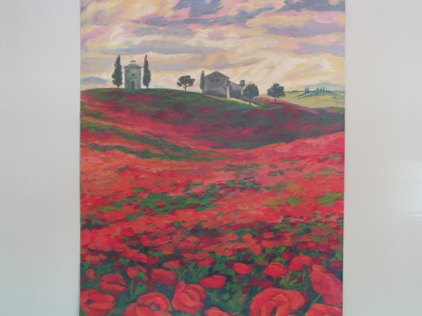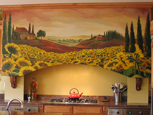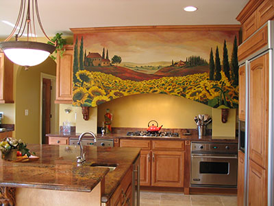 This is my favorite mural for how it works in the space. The client saw the movie "Under the Tuscan Sun" and loved the landscapes and wall finishes. They designed their entire house structurally to feel like a Tuscan villa. The house is wide open, so you can see through to kitchen from anywhere. This mural helps set the tone for the house. The client loved the fields of poppies and sunflowers, the villas, and the rolling countryside. She prefers bold color, so with that in mind, I painted a very ambitious and bold painting. The sample was all poppies to the foreground, modeled from a scene straight from the movie. After seeing the sample, the client wanted sunflowers and I accommodated. The composition change from the sample required doing a second sample sketch (not shown below). She wanted tall Cyprus trees and the buildings to be more squat. I altered the colors of the sky to draw in similar tones found throughout the room and in the wood. The yellow of the Poppies mirrors the yellow of the walls. The oven hood is atypical. The panel is flush with the cabinetry, and is very large and very conducive for a mural. There are two coats of polyurethane on the hood to protect it from splatters. I used a water-based polyurethane so that it would not yellow over time. If you like this mural, you may also like the Italian Villa Inspired Dining Room in the same house. Click on the pictures below to see details. |
