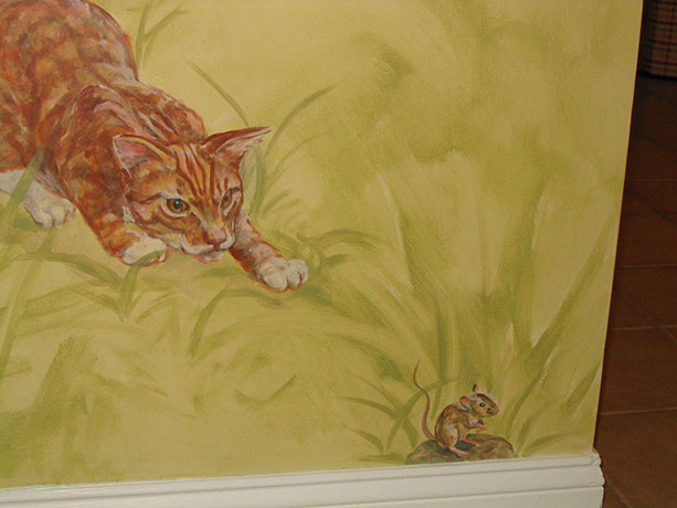 This room connects to a mud room which connects to the driveway, garage, and a backyard pool. As such, it is the first real room seen in the client's home. She wanted to create an environment, for her twins, that would ease the family from the garden and views outdoors to this playful intermediary room indoors. She and her family spend a great deal of time enjoying the countryside of Jarretsville, Maryland. Also, she had begun a taped-up gallery of her twins' artwork over many of the walls. The cherished various arworks collectively creating a visual paper avalanche as soon as one entered the house. She wanted a more contained orderly way to display their work and an environment that would inspire their creativity. With this in mind we planned a huge magnetic blackboard to be painted on the one wall not visible from the entrance ways. It is tall enough to offer plentiful gallery space at the top for papers and ample space below for the twins' self-prescribed "his" and "her" sides for chalk drawings. The blackboard is framed by a plaid strip to match the cheery plaid drapery. The drapery set the color themes: the walls were already a pale yellow to match, and the cherry-coral red and spring green also featured prominently in the mural. The client and I planned color washy green foliage: tree leaves, grasses, and vines to act as borders and a unifying color theme in the room. The red was used as points of punctuation around the room. The twins love animals and bugs so their mom requested bluebirds, a cicada to subtely note the year (2004), their cat and the pony the family had just adopted (pictured with her foal), as well as sunflowers. Most of the other animals were chosen at my discretion. The design is very animated. I tried to add masculine elements such as the client's cat ready to pounce on a mouse, along with feminine elements such as the birds and flowers. Even the client's husband, a builder by trade, in the end couldn't help but be charmed by the little horse farm complete with barn and silo! You can see a similar painted chalkboard in my Train Station Mural. Click on the pictures below to see details. |